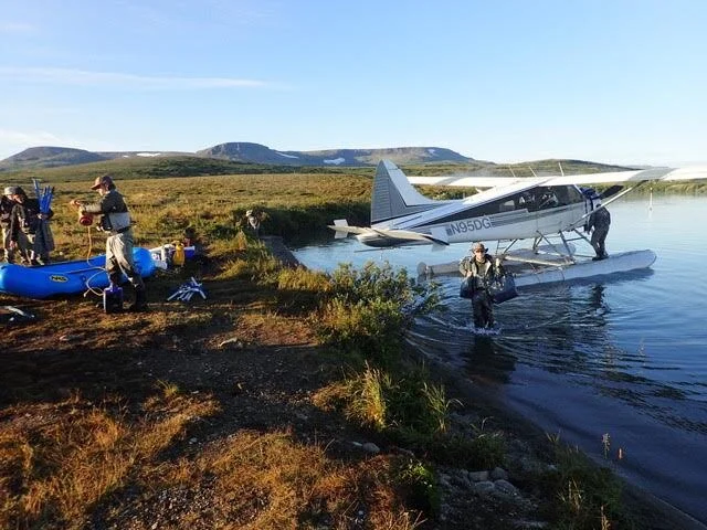 Our two guides, Evan and Chandler, both young college graduates who wanted to do some more guiding before settling into a desk job rode with us in the Beaver. Our pilot, Troy or “T-Bird” was a character. Though an excellent pilot he loved to tease us with lines like, “Well boys, we cheated death again.” He landed us on a beautiful lake on the tundra; much different than the conifer-covered mountains we’d seen most of the week. The two rafts were deflated and strapped to the plane’s floats. The guys used a portable generator and an air pump to get them inflated quickly.