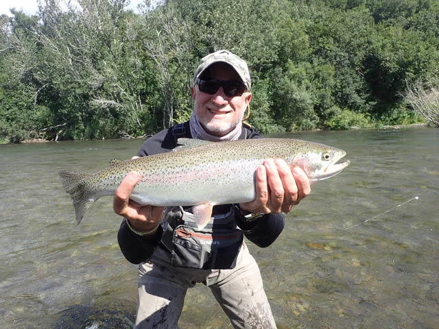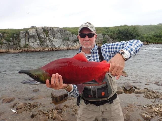 One particular rainbow will ever be fixed in my memory. Hayden had pointed out his silvery shape behind a small pod of red salmon. I made as cast a few feet upstream and we watched as he moved to eat my bead. I set the hook and he turned and ran downstream so fast it took a second for me to realize that all my fly line was gone and what was screaming out the end of my rod was chartreuse colored backing! With Hayden’ expert help, we landed that fat boy after an epic struggle. He measured twenty-three inches long and was as big around as a football.