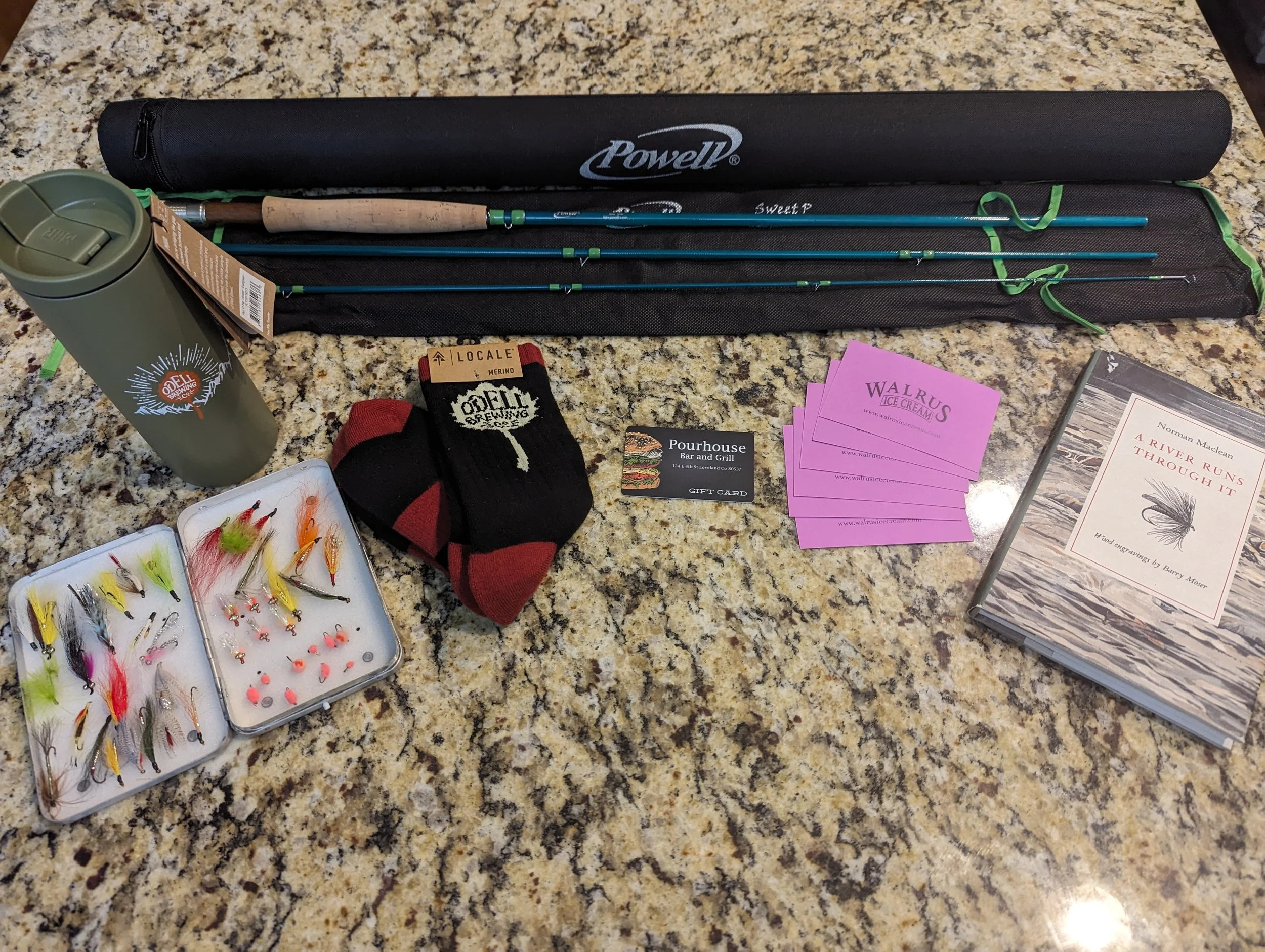 Powell fiberglass rod, salmon fly/streamer selection in vintage Perrine box, local gift cards, and Odell's swag
