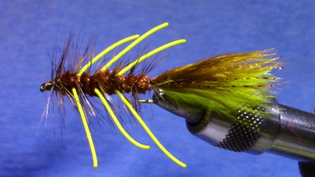 This fall favorite by Tim Heng excites those aggressive fall brown trout. I suspect this pattern originated on the Roaring Fork, but the brown and yellow scheme is money in the bank on the North Platte.