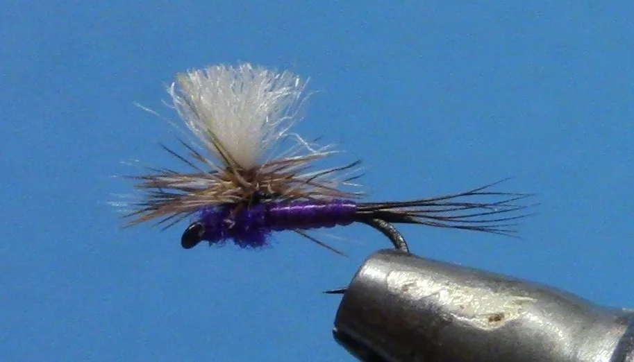 If a trout is inclined to eat, there is something about purple that gets attention. This fly is a Adams Parachute with a purple paint job, so you get the added value of an imitative profile to go with the attractor color. The use of spandex for a smooth but segmented abdomen makes for a sharp looking fly, and eliminates a dubbing step!