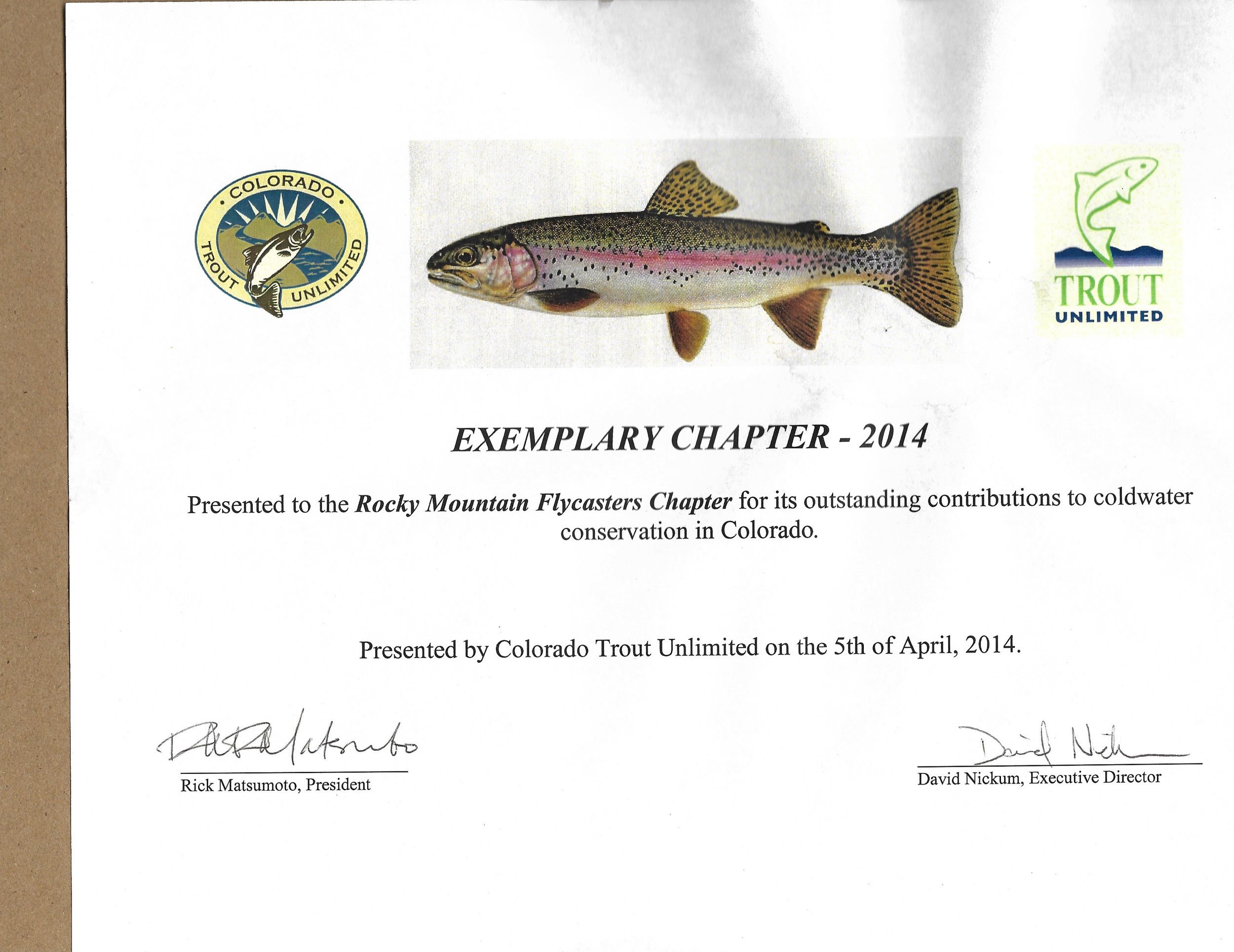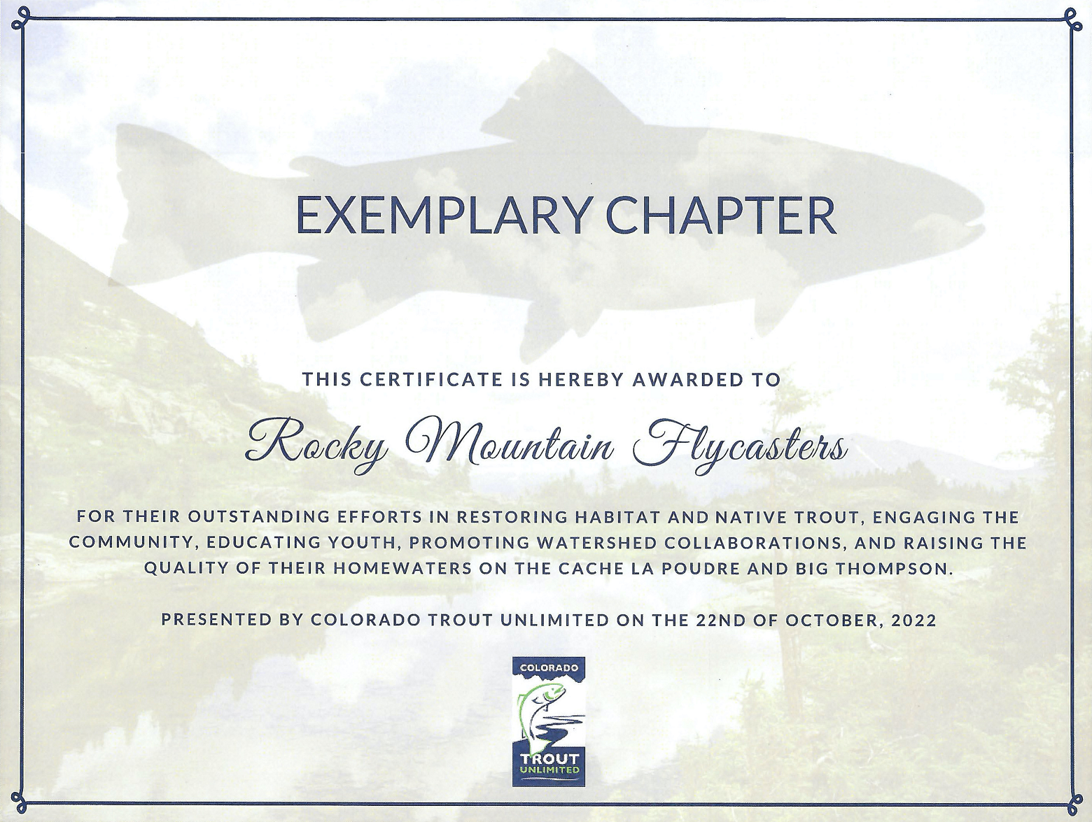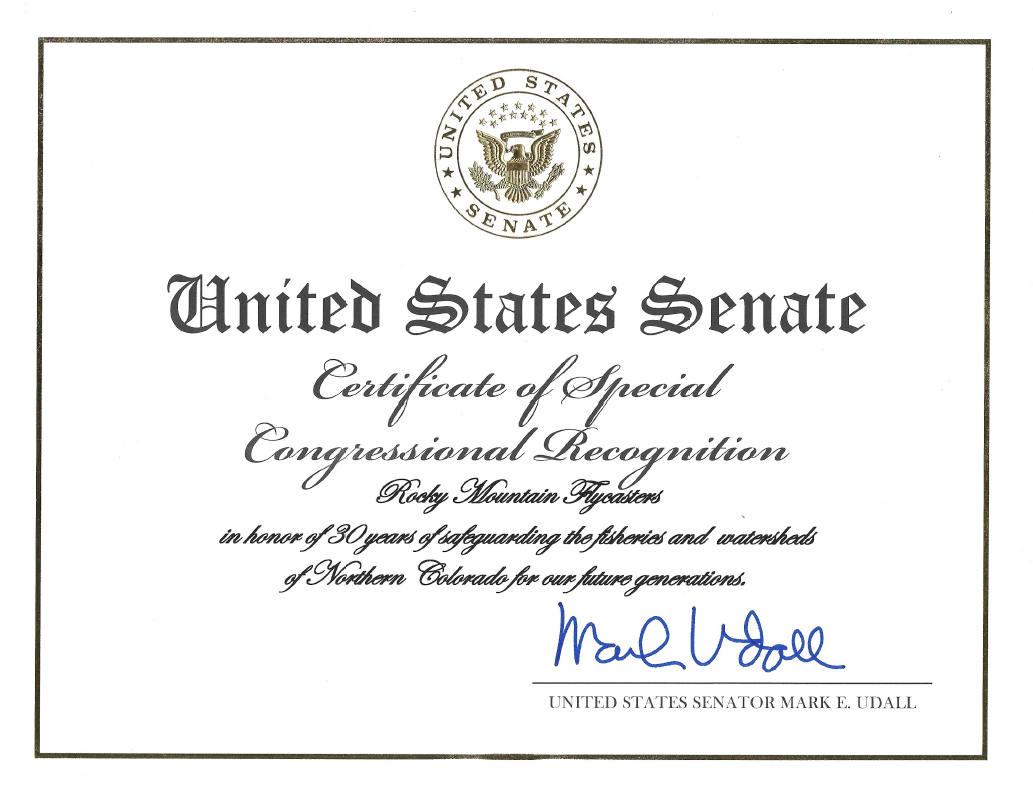 Over our years as a Trout Unlimited chapter the Rocky Mountain Flycasters’ chapter and our members have been recognized for many awards. Below is a small list those awards.