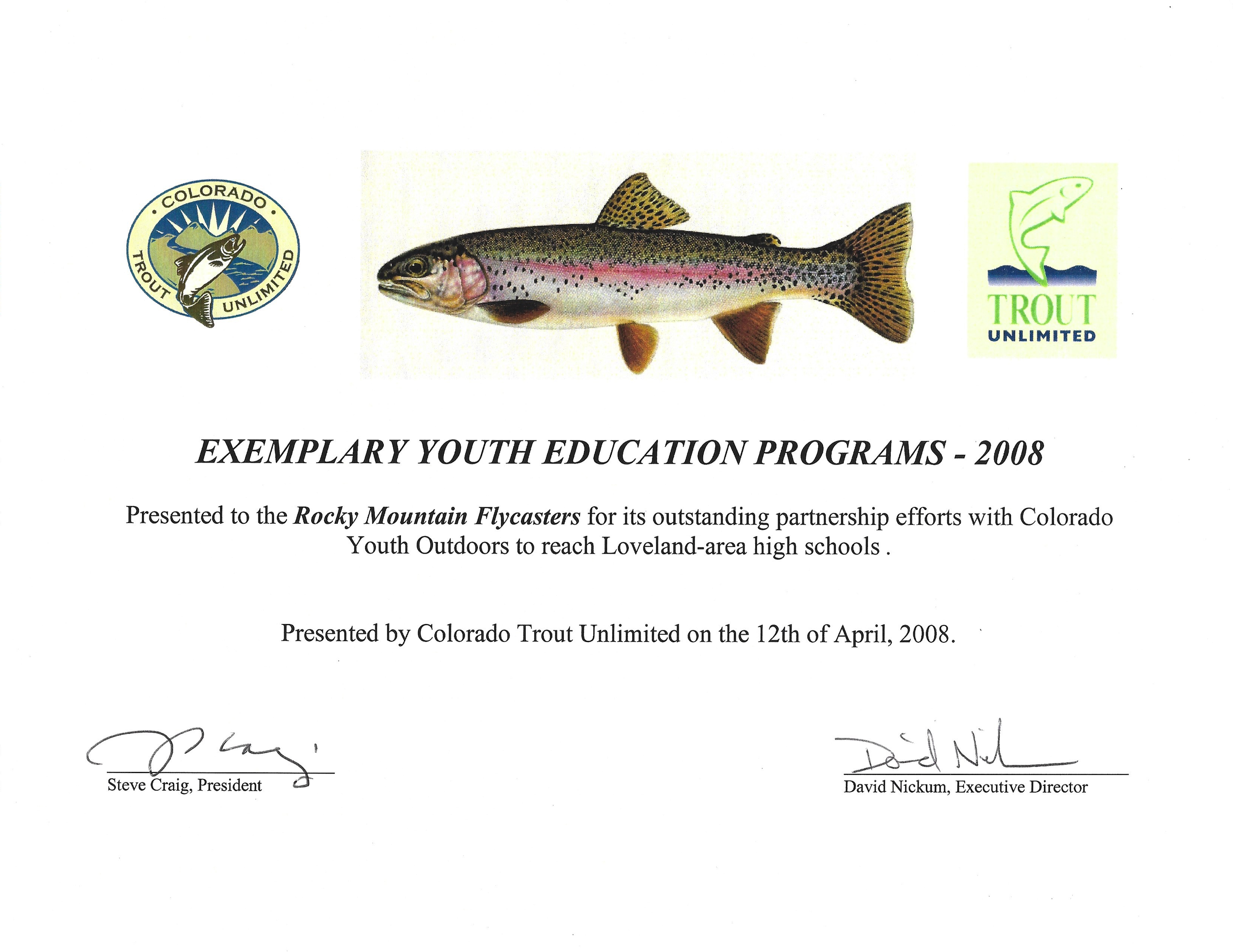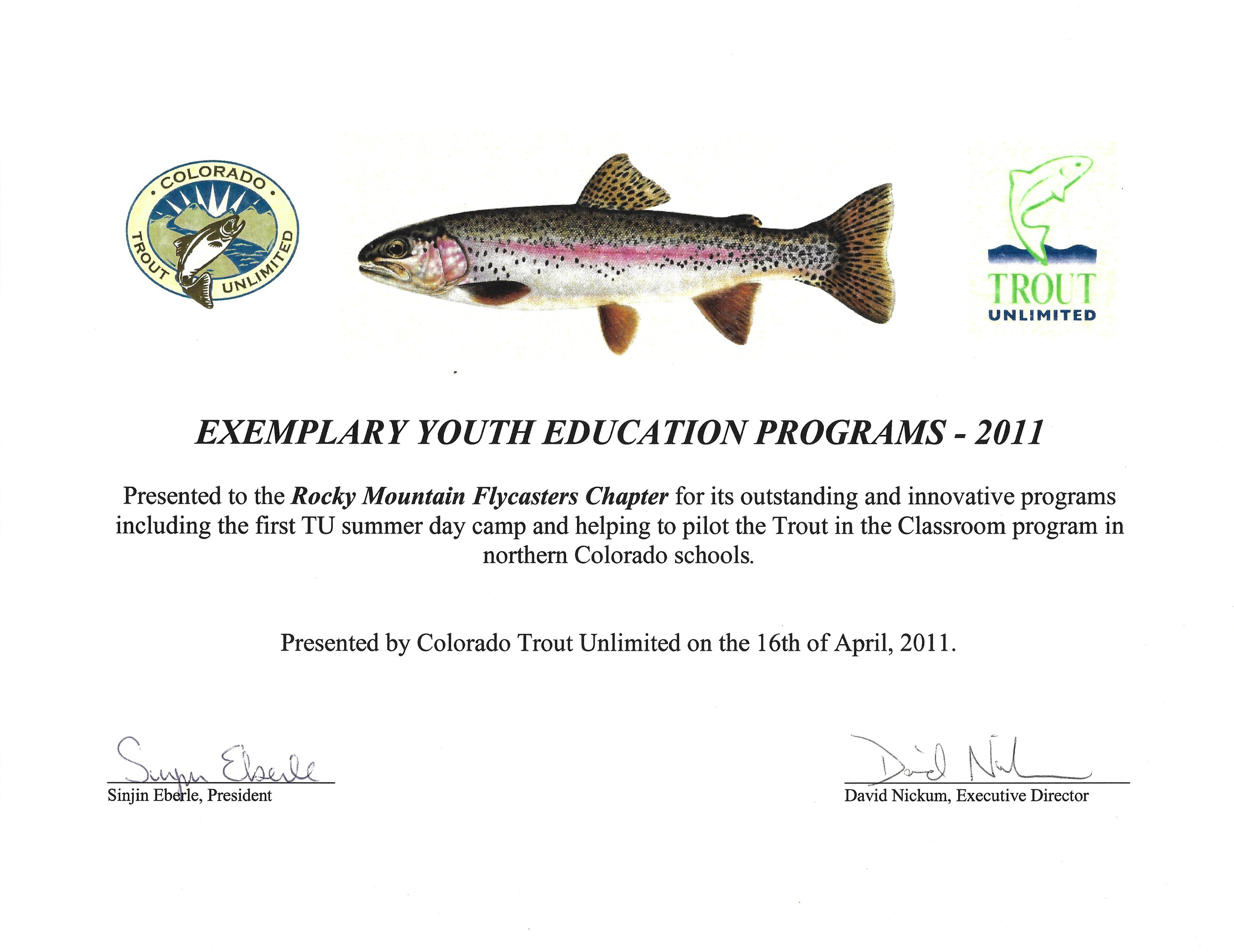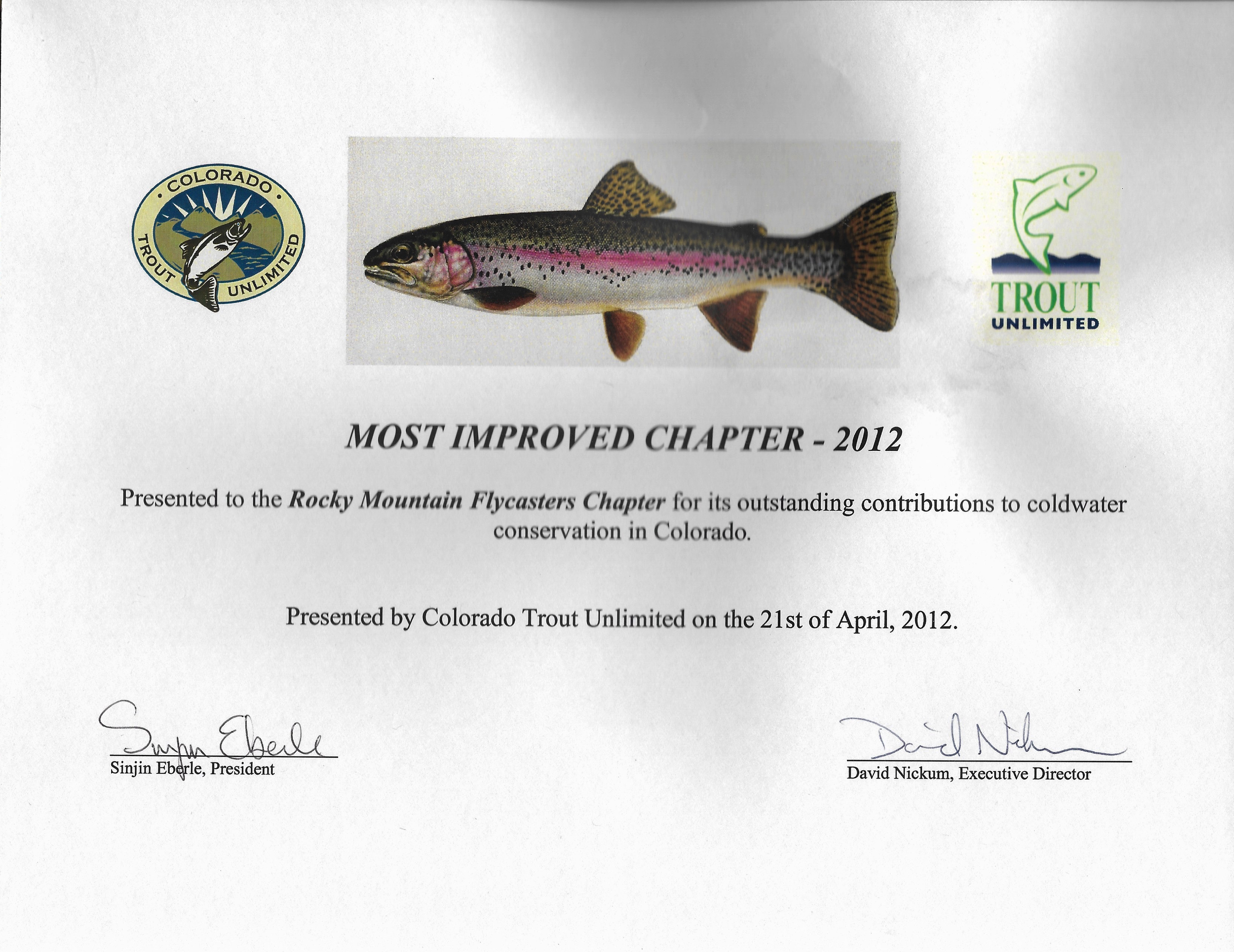 Over our years as a Trout Unlimited chapter the Rocky Mountain Flycasters’ chapter and our members have been recognized for many awards. Below is a small list those awards.